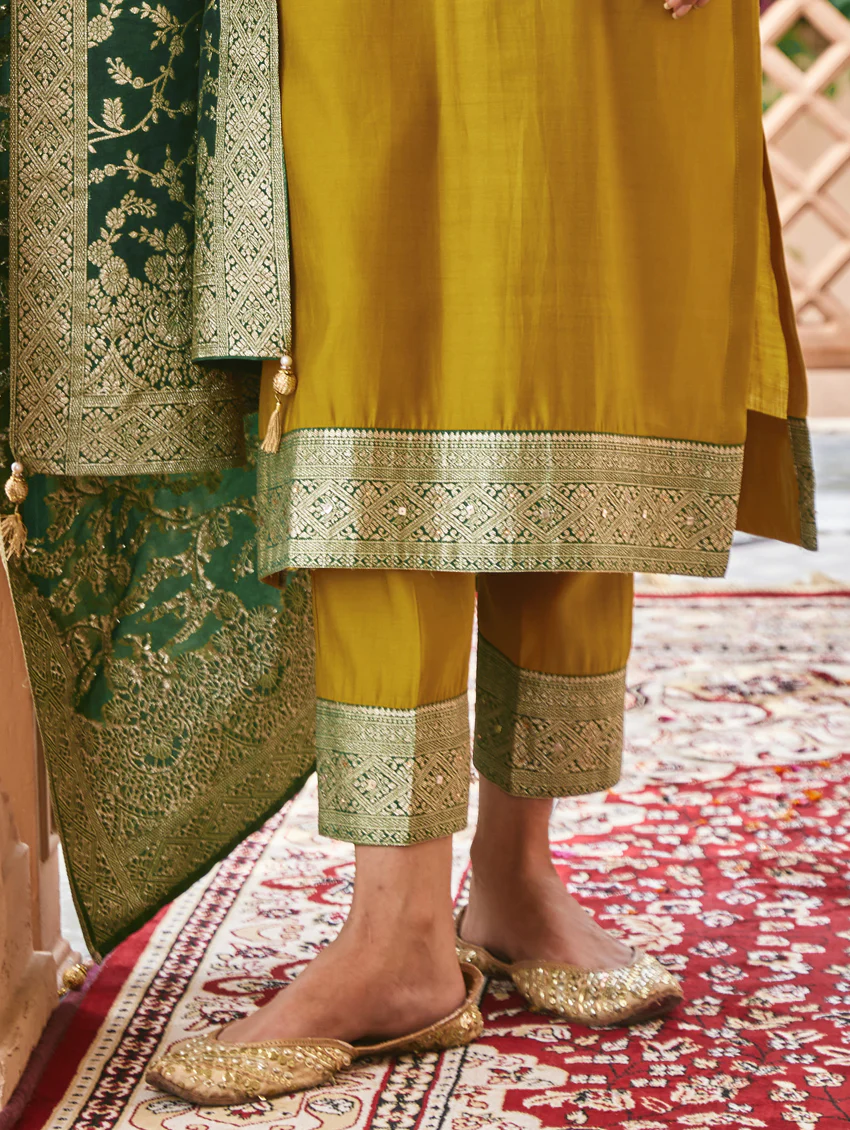 The suit set features meticulously designed embroidery, showcasing the brilliance of traditional artistry. Made from breathable and high-quality fabric, it offers all-day comfort while maintaining its style appeal. The rich yellow tone combined with intricate patterns creates a look that’s both modern and classic.